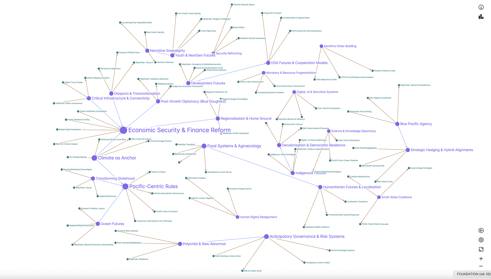 Now pick a platform to map the themes - tools like Kumu or Mermaid are free and relatively easy to use. Below is an example of research themes I pulled and then mapped in Graph Commons.
