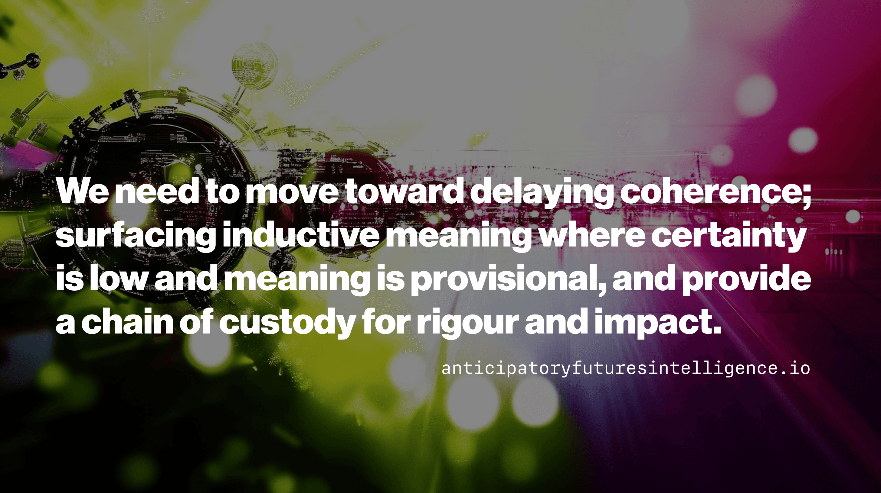 As foresight knowledge and futures intelligence necessarily becomes more anticipatory, our methods must enable us to toggle between creativity and rigour, and they must support emergence, fluid meaning, and traceable synthesis in ways that catalyse agency, build credibility, encourage reflection and inspire re-imagination.
