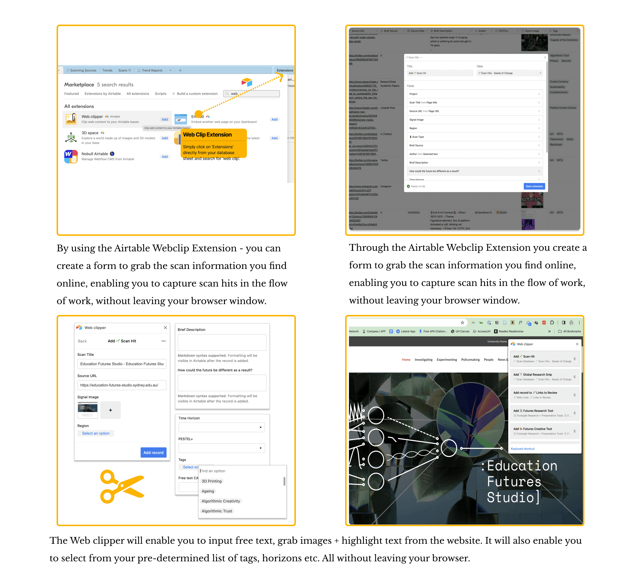 By using the Airtable Webclip Extension - you can create a form to grab the scan information you find online, enabling you to capture scan hits in the flow of work, without leaving your browser window.