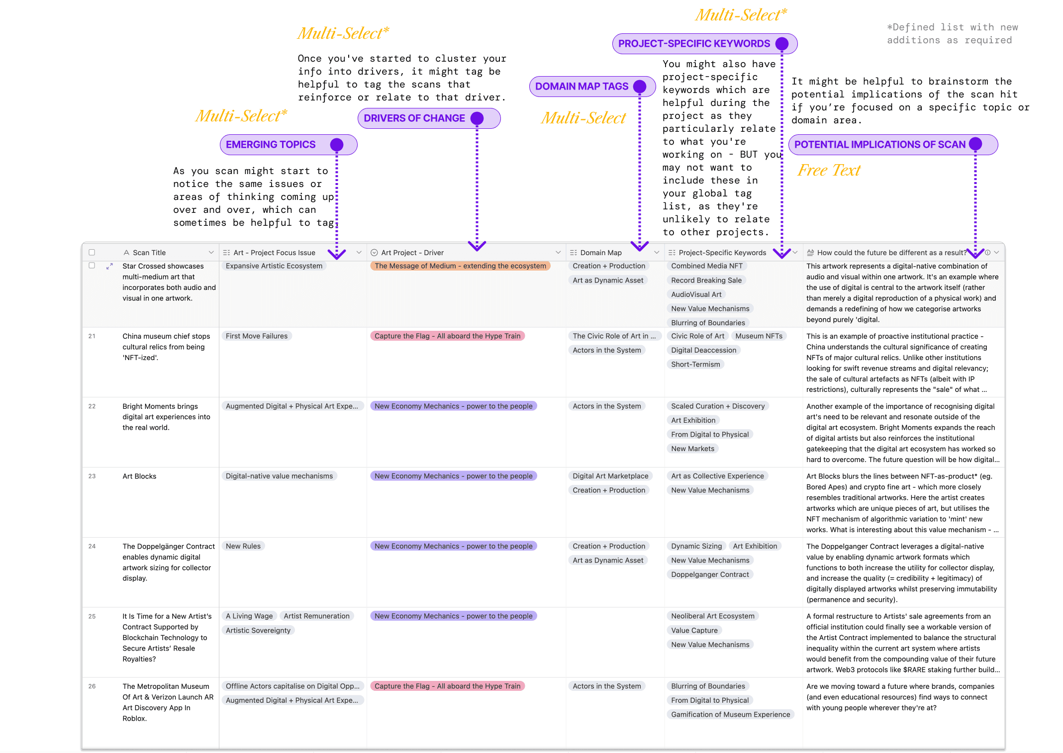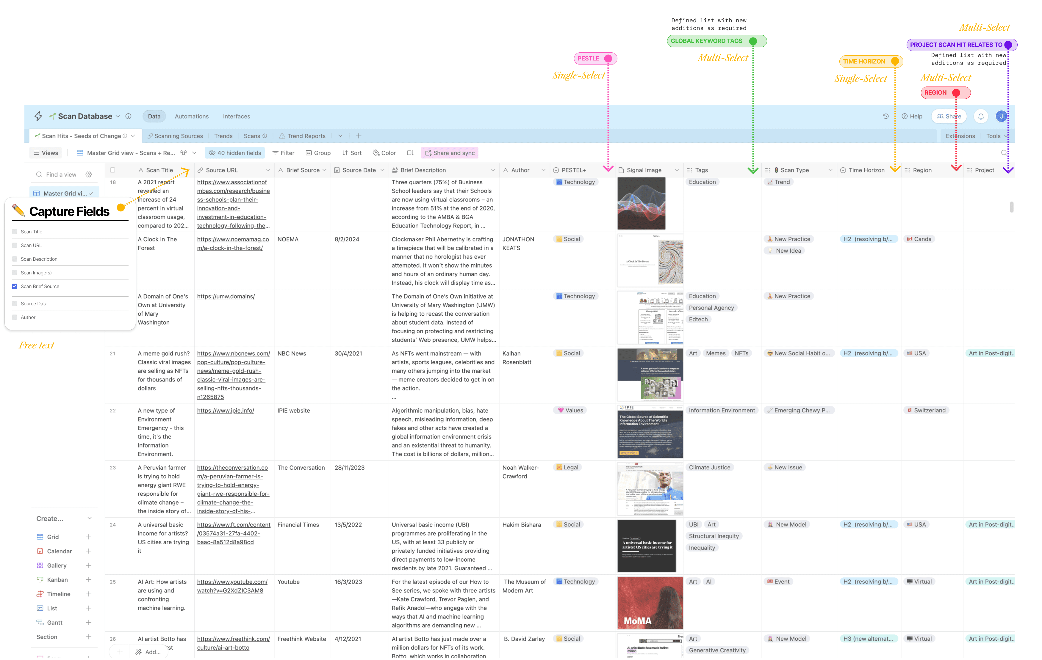 Creating a pre-determined list of multi-choice selections for global tags ensures that you tag scans consistently, Airtable also pre-populates the fields as you type which makes input easier and searching more effective over the long term.